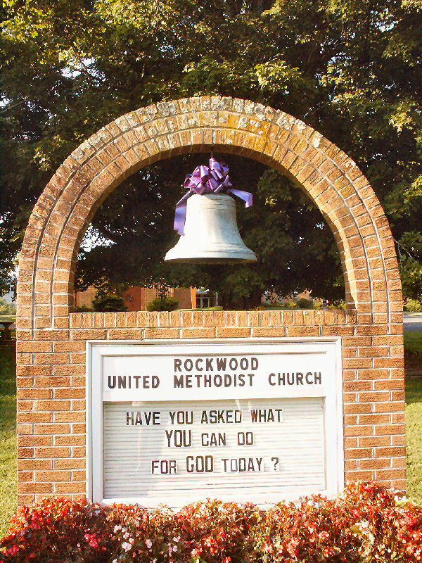 On the lawn of Rockwood United Methodist Church proudly stands the old church bell from Kingston Avenue Methodist Church. The church bell, which M. H. Phillips had made at the old Roane Iron Company, is one of the few things salvaged from the burnt church building, and serves as a reminder of our church history.
