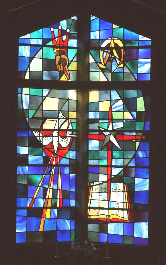 The beautiful chancel window in the Rockwood United Methodist Church is built around the massive concrete cross, the main symbol of the Christian Faith. At the heart of this is the Triangle which stands for equality, oneness, and unity of the Third Persons in the Godhead. The remainder of the window defines each person of the Trinity and His work. The upper left panel: The hand of the Father, with his kingly crown, symbolizing His work of creation. The upper right panel: The Alpha and Omega – first and last letters of the Greek alphabet – which are the symbols of the Son, Jesus Christ, who said, “I am Alpha and Omega, the beginning and the end, the first and the last.” (Revelation 22 – 13). The lower left panel: The descending Dove is the Holy Spirit. The fiery red about the Dove symbolizes His purifying, sanctifying power, and the three rays traditionally signify the Trinity. The lower right panel represents the plan of salvation as planned, executed, and applied by the Father, the Son, and the Holy Spirit. The Bible, with its four crosses representing the four Gospel writers, tells of: the love of the Father who sent the Son, the earthly ministry of the Son from his birth (the Star of Bethlehem) to his death and resurrection, the empty red cross symbolizing the shedding of his precious blood, after which He arose from the tomb the third day: the promise and coming of the Holy Spirit who applies the atoning work of Christ to our lives and is our faithful Comforter and Guide.